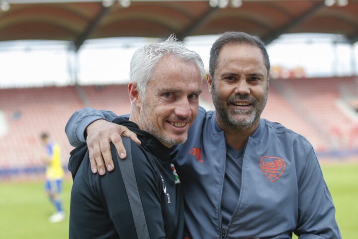 L’entraîneur des Lusitanos, Bernard Bouger (à gauche), était satisfait du match nul rapporté de Créteil par les Lusitanos (1-1) à l’issue de cette 29ème journée de N2 de football, confortant la deuxième
