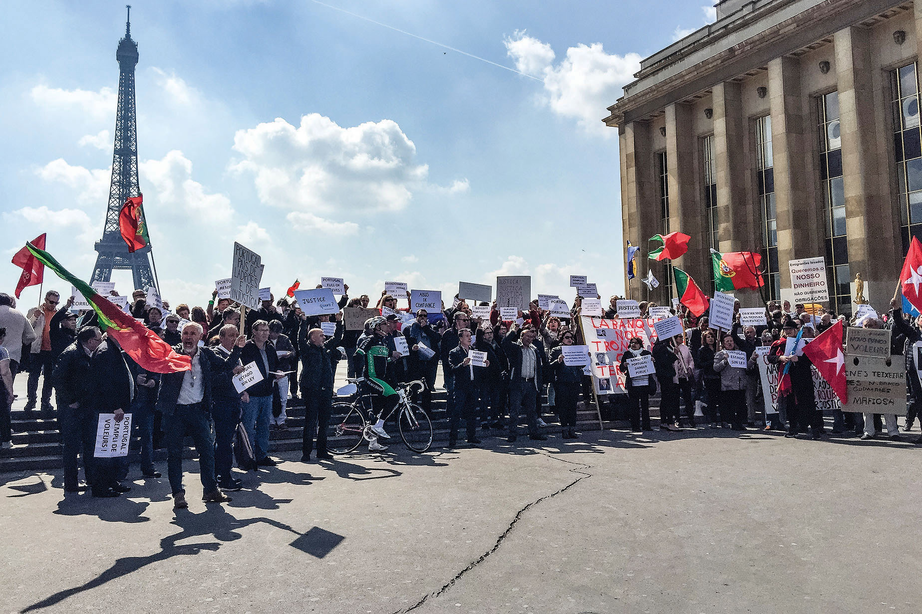 Na praça do Trocadero, perante centenas de turistas que passavam e paravam para ler os cartazes, muitos deles em várias línguas, Manuel Sousa, de 65 anos, segurava uma faixa onde se lia “Portugal – o país onde o terrorismo financeiro é aceite”, afirmando à Lusa que voltou a protestar para dizer “basta!”