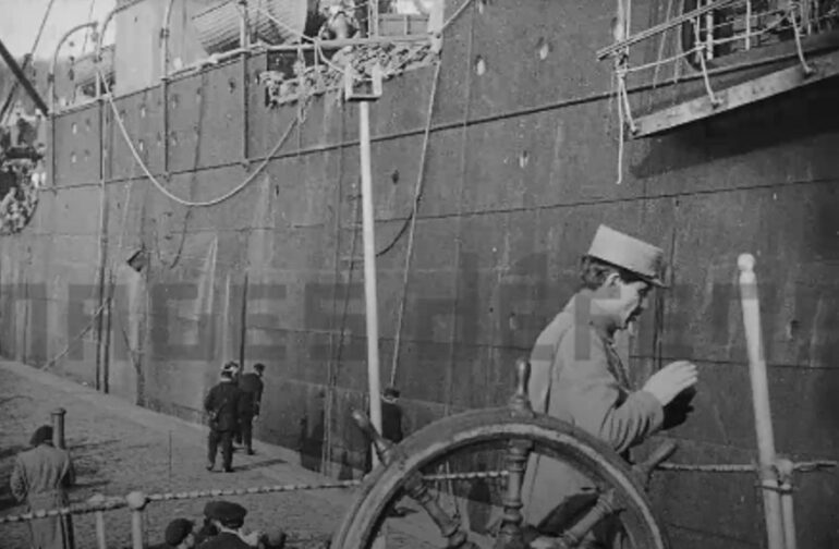 Home Comunidade L’extraordinaire film du 1er débarquement du Corpo Expedicionário Português (CEP) à BrestAntónio Marrucho·25 Março, 2024Comunidade Le 2 février 1917 restera comme un jour historique de la participation du Corps Expéditionnaire Portugais (CEP) à la I Guerre mondiale. À cette date, accoste, bien loin du front qui leur était attribué par les anglais, le premier bateau de soldats du CEP, le paquebot «City of Bénarès». Dans la publication : “Memória abrantina da Grande Guerra” de António Alpalhão, aux editions Chiado Books, nous apprenons les circonstances du premier voyage du convoi : “il était composé de 4 bateaux; le City Bénarès, le Bellerophon, Bohemia et Inventor, escortés par des destroyers britanniques, auxquels se sont joints, de la Marinha portugaise, “le croiseur Pedro Nunes, un autre croiseur et 2 destroyers”. À leurs bord 6.357 hommes (209 officiers, 88 sergents et 6.080 soldats), 457 solipèdes (chevaux et mules), 140 voitures hippomobiles et 60 véhicules motorisés. Faisaient partie du convoi : les Régiments d’infanterie n° 7, 15, 21, 22 et 34, un escadron de cavalerie, le 1er groupe de batterie d’artillerie, l’ambulance n°1, une colonne de transport de blessés et une partie du train automobile. Cette première flotte, après dix jours en face de Cascais, prend le large le 30 janvier. Ça restera le pire des voyages du CEP, 3 jours de mer déchaînée jusqu’à l’arrivée à Brest, le 2 février. Les navires portugais n’ont pas conclu le voyage. Pedro Nunes est revenu à Lisboa, et les autres sont rentrés à Leixões. Deux des destroyers britanniques, en panne, ont été déviés vers Davenport. Le plus remarquable : dans l’histoire, pour l’histoire, l’histoire que nous allons raconter est tirée d’un film vidéo, évidemment muet, de 17 minutes et 16 secondes (voir ICI). Oui, vous avez bien lu, plus de 17 minutes… un film, reportage extraordinaire pour l’époque. Un film témoignage, plein d’enseignements, exemple d’une organisation, un avant-goût d’une difficulté majeure, le climat auquel ils n’étaient ni habitués ni préparés, que membres du CEP auront à affronter en terre ferme! À voir les images, les sourires, même ceux de Gomes da Costa (pour la caméra?), les soldats et le commandement sont-ils conscients de ce qui les attend? Le film permet de dévoiler des visages inconnus, mais aussi connus, grâce à l’acharnement de passionnés, tels que José Carlos Durão et Sérgio Durão (voir ICI et ICI), d’une précieuse aide pour le présent article. Le film fait partie de établissement Cinématographique et Photographique des Armées. Un patrimoine gigantesque, avec 380 mille photos et 2.000 heures de films, classés par période : I Guerre, II Guerre, Indochine, Algérie… Le cameramen des images sur l’arrivée et débarquement des soldats portugais à Brest s’appelle René Meunier, accompagné par le photographe Albert Samama-Chikli. Les prises de vues sont réalisées à partir de plusieurs endroits du quai et sur le bateau… Le bateau arrive, il est remorqué, des ouvriers s’affairent dans le quai pour l’amarrage. Des images témoignent de comment sont habillés les soldats et officiers. On voit du matériel qui est déchargé, il y a des soldats partout, une occupation des ponts bien chargée par des hommes qui doivent se demander ce qu’ils viennent faire dans ces contrées inconnues. Le drapeau à l’avant confirme que le bateau est bien anglais. Les officiers filmés sont plutôt moustachus, les jeunes soldats n’arborent pas encore de moustache ou très peu… signe d’une fin d’adolescence encore toute récente? Des soldats quittent le “City of Bénarès” par une passerelle en forte pente et très glissante, à 14 minutes et 15 secondes du film, on distingue très bien la neige qui tombe, un aperçu d’une des difficultés que ses valeureux soldats vont rencontrer en terres de Flandres. Sur la tête des soldats un béret ou une cagoule, style de Madeira. Sur le quai, on distribue à manger dans des gamelles carrés, ça fume, une fanfare part au rythme de marche, la population de Brest regarde les soldats défiler, sur fond d’écran, un train… pour transporter du matériel? Des soldats alignés proches du bateau, reçoivent ordre… ça y est, c’est parti… pour quelle destination? Dans un premier temps, la Gare de Brest. On voit passer une fanfare de fusiliers-marins français qui défilent… Beaucoup de soldats partent avec une couverture entourée au dos… malgré les soldats déjà débarqués, des images montrent le bateau aussi rempli de soldats… les cales qui se vident? Des soldats sur le bateau saluent avec leurs bérets la population sur le quai. Le film se termine par des soldats qui montrent leur grande gamelle… destinée à recevoir le manger ou pour se laver? On reconnaît dans le film plusieurs personnalités, officiers notoires, à commencer par le Lieutenant-Colonel Gomes da Costa, responsable de la deuxième division d’infanterie, futur Président de la République. On le voit dans le film à la 50ème seconde, et à une minute et 7 secondes. Nous nous intéresserons à d’autres officiers : José Maria da Veiga Cabral Beleza dos Santos, à João António Vasconcelos et à Adriano Augusto Trigo. Le Capitaine Beleza Santos apparaît dans le film dès la 6ème seconde, puis à la 30” (juste derrière le commandant du navire), 9’ 20” et 9’ 50”. Le voyage du Capitaine Beleza a été d’une durée, comme pour la majorité des autres membres du bateau, de 14 jours. Parti en train, il rejoint Thérouanne. Il séjournera dans le village 35 jours en compagnie de son bataillon, les soldats reçoivent des instructions avant de rejoindre front. Beleza dos Santos faisait partie de Artilharia n°2, 4° Batalhão. La presse de l’époque le montre en photo. Les faits, sont décrits dans sa fiche militaire : il a 