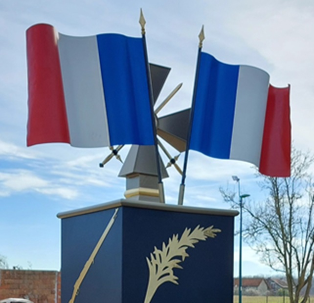 – Deux drapeaux français en arrière-plan, bleu, blanc, rouge, incarnent la Nation, la République et le sacrifice consenti pour la France.