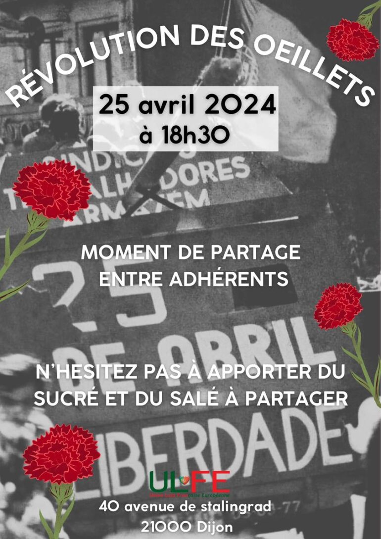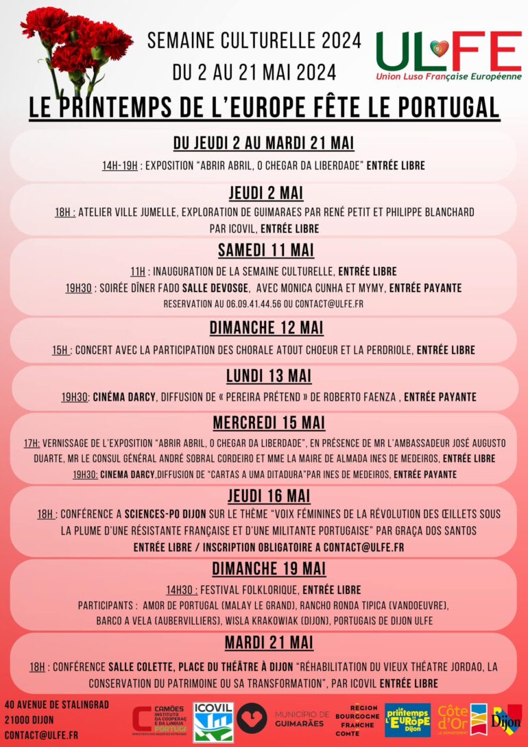 Home Associações Revolução dos Cravos em grande destaque na Primavera da Europa em DijonChico Correia·24 Abril, 2024Associações Portugal, Guimarães e a Revolução dos Cravos estarão em grande destaque na 17ª edição da Primavera da Europa (Printemps de l’Europe), organizado pelo Município de Dijon, que se realiza anualmente durante o mês de maio, um evento no qual a Semana Cultural da União Luso-Francesa Europeia (ULFE) está inserida. Com um programa rico em eventos culturais, recreativos e gastronómicos, a Primavera da Europa deste ano terá uma vez mais a parceria da Associação ULFE, mas também a parceria da Cidade de Guimarães com a qual Dijon está geminada. Exposições, conferências, projeções de filmes, noite de fados e festival folclórico constam do programa. A exposição “Abrir Abril, o chegar da Liberdade” vai estar patente ao público, todos os dias, das 14h00 às 19h00, na Casa de Portugal, a sede da ULFE, em Dijon, mas a inauguração oficial só vai ter lugar no dia 15 de maio, na presença do Embaixador de Portugal em França, José Augusto Duarte, do Cônsul Geral de Portugal em Lyon, André Sobral Cordeiro, e também da Presidente da Câmara Municipal de Almada e antiga Deputada, Inês de Medeiros. E no dia 2 de maio, às 18h00, está programado um atelier “Exploration de Guimarães” por René Petit e Philippe Blanchard. A abertura oficial da Semana cultural está programada para o dia 11 de maio com um jantar de Fado, para o qual a associação convidou os fadistas Mónica Cunha e Mymy, acompanhados por Filipe de Sousa e Dominique. No dia 12 de maio está anunciado um concerto com os grupos corais “Atout Coeur” e “La Perdriole”. No dia 13 de maio vai ser projetado o filme “Pereira Prétend” de Roberto Faenza e no dia 15 de maio vai ser projetado o filme “Cartas de uma Ditadura” de Inês de Medeiros, na presença da realizadora. No dia 16 de maio, Graça dos Santos, professora da Universidade de Paris Nanterre, vai proferir uma conferência na Sciences Po Dijon sobre “As vozes femininas da Revolução” e uma outra conferência vai ser proferida no dia 21 de maio para apresentar a reabilitação do velho Teatro Jordão, em Guimarães. Como não há festa sem folclore, a sala polivalente da Associação ULFE vai acolher, no dia 19 de maio, domingo, um Festival de folclore com a participação dos grupos Amor de Portugal de Malay-le-Grand, Ronda Típica de Vandoeuvre, Barco à Vela de Aubervilliers, Wisla Krakowiak de Dijon e Portugueses de Dijon ULFE.