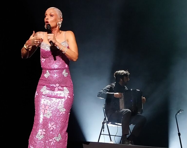 Mariza commença d’entrée avec «Há festa na Mouraria», un fado traditionnel emblématique du légendaire Alfredo Marceneiro. Un poème sans prétentions sur une fête populaire, sur une belle musique de fado. «Tio» Alfredo le chantait avec bonhomie, Mariza y met un rythme saccadé, presque violent : est-ce une bonne idée ? Pas sûr. C’est dommage, parce que ce sera le premier et avant dernier moment de fado traditionnel du concert. Le second, où, comme à chaque concert, Mariza descend dans la salle, micros coupés pour elle et ses musiciens, chante un «fado corrido», constitue certes un exploit vocal, très apprécié par le public qui l’applaudira debout. Une performance, oui, mais…