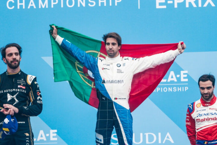 O Português António Félix da Costa (no centro na foto), ao volante de um BMW, venceu, no sábado 15 de dezembro, a corrida inaugural do Campeonato do Mundo de Fórmula E de