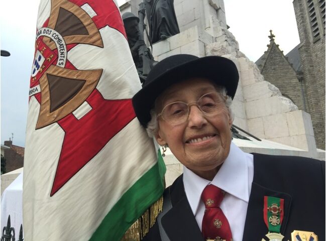 Félicia Pailleux Assunção, 91 ans, est le porte-drapeau du Corps Expéditionnaire Portugais dans le nord de la France, depuis qu’elle a reçu en 1975 ce fier héritage de son père João Assunção,